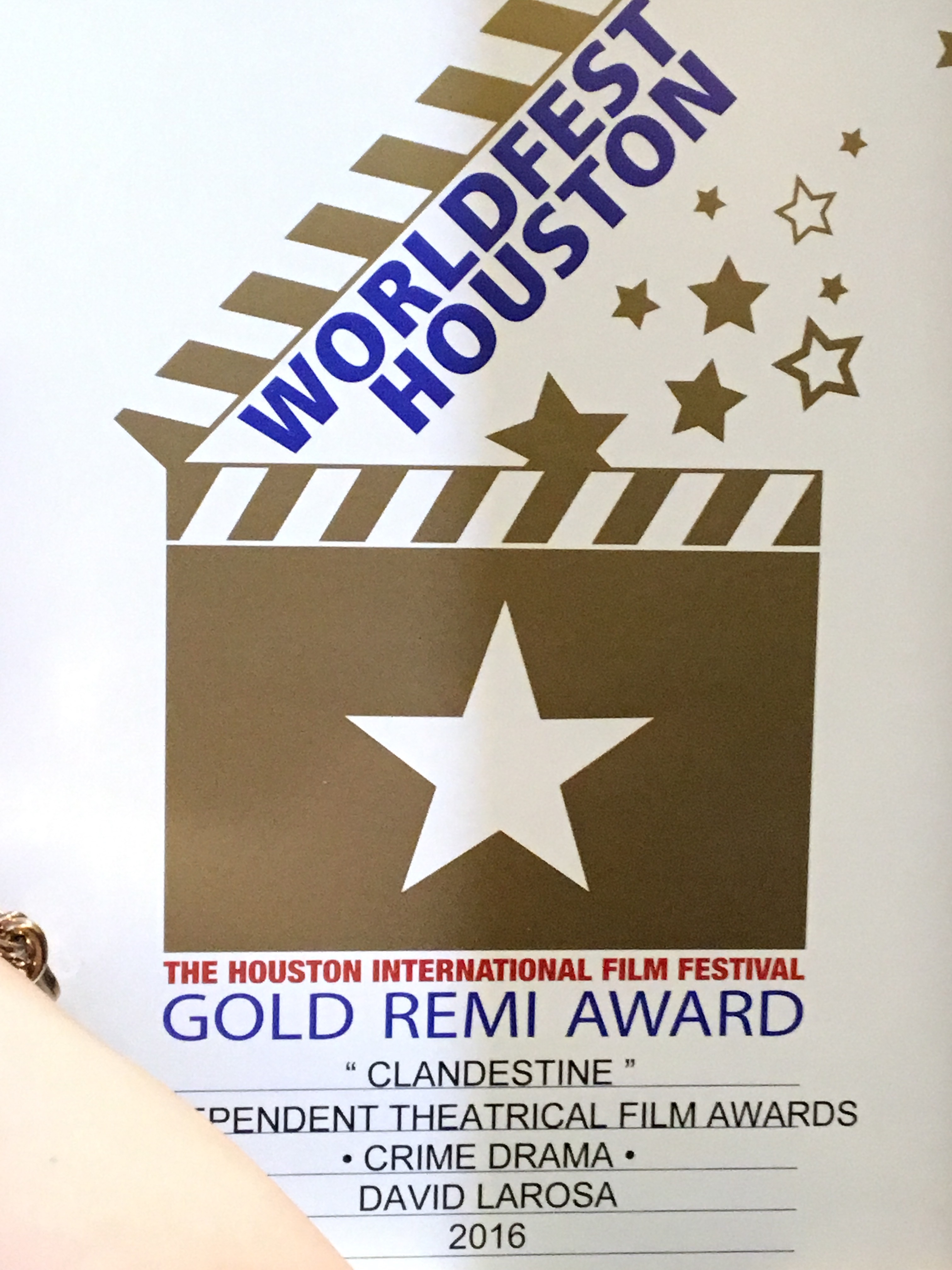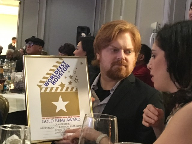 Clandestine director David LaRosa was presented the gold for Crime Drama, and immediately shared it with the team. That would have capped the night and the trip, but he had also been nominated for Best Supporting Actor, and Nick DeMatteo (the “usual suspect” to the left pictured earlier in this blog) was nominated for Best Actor. What a night…