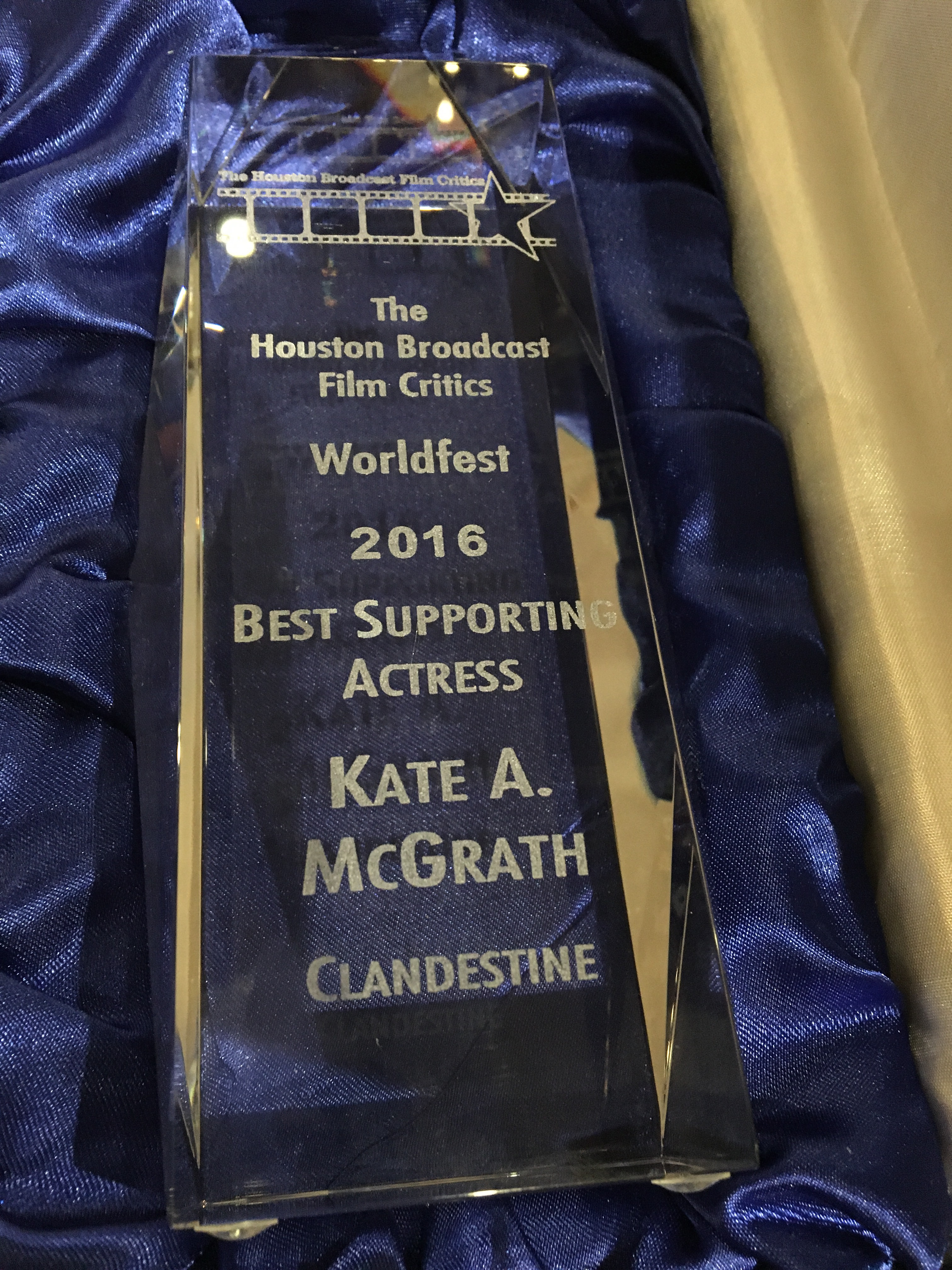 Kate A. McGrath won Best Supporting Actress from the Houston Broadcast Film Critics. Presenter Nick Nicholson made sure the crowd new that she also wrote Clandestine, with which he said he was quite impressed.