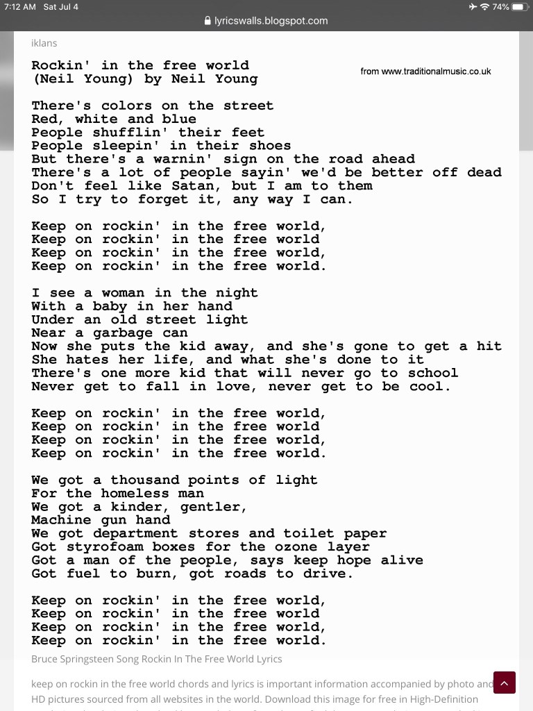 Wow, devastating lyrics that depict the many horrendous government failures at the time of its release. So we see the irony that the chorus sets up in contrast to the lyrics. Blistering and intelligent and easy to catch, if you bother to listen, of course. So blistering, in fact, that if the song was used to set the tone for a major event, it would be humiliating for the star attraction. I mean, she or he would know the meaning of songs used to represent them, right? The star would know at least that much, yes? Surely, they would because otherwise the reaction of the informed public would be laughter at such a buffoon. Who would willingly set themselves up for that? And imagine if such a clown stepped on a rake in this way while standing, say, a national monument? Can you imagine the national reaction?