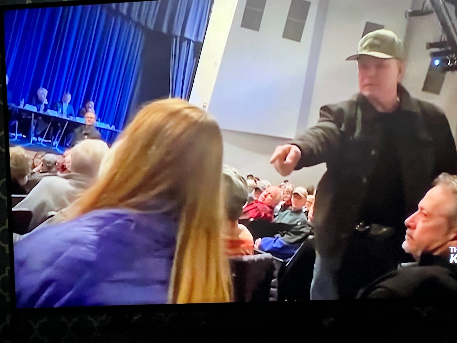 To the left in the picture above is Dr. Teresa Borrenpohl being confronted by Kootenai County Sheriff Bob Norris, who wanted her to leave an alleged town hall meeting for asking the legislative panel, “Is this a town hall, or a lecture?” Now, it is generally understood that town hall meetings are designed for citizens to ask elected officials questions. Secondly, videos of this meeting document others calling out comments, but only Borrenpohl, a Democratic candidate who has run unsuccessfully in that Republican region, was targeted for removal.
