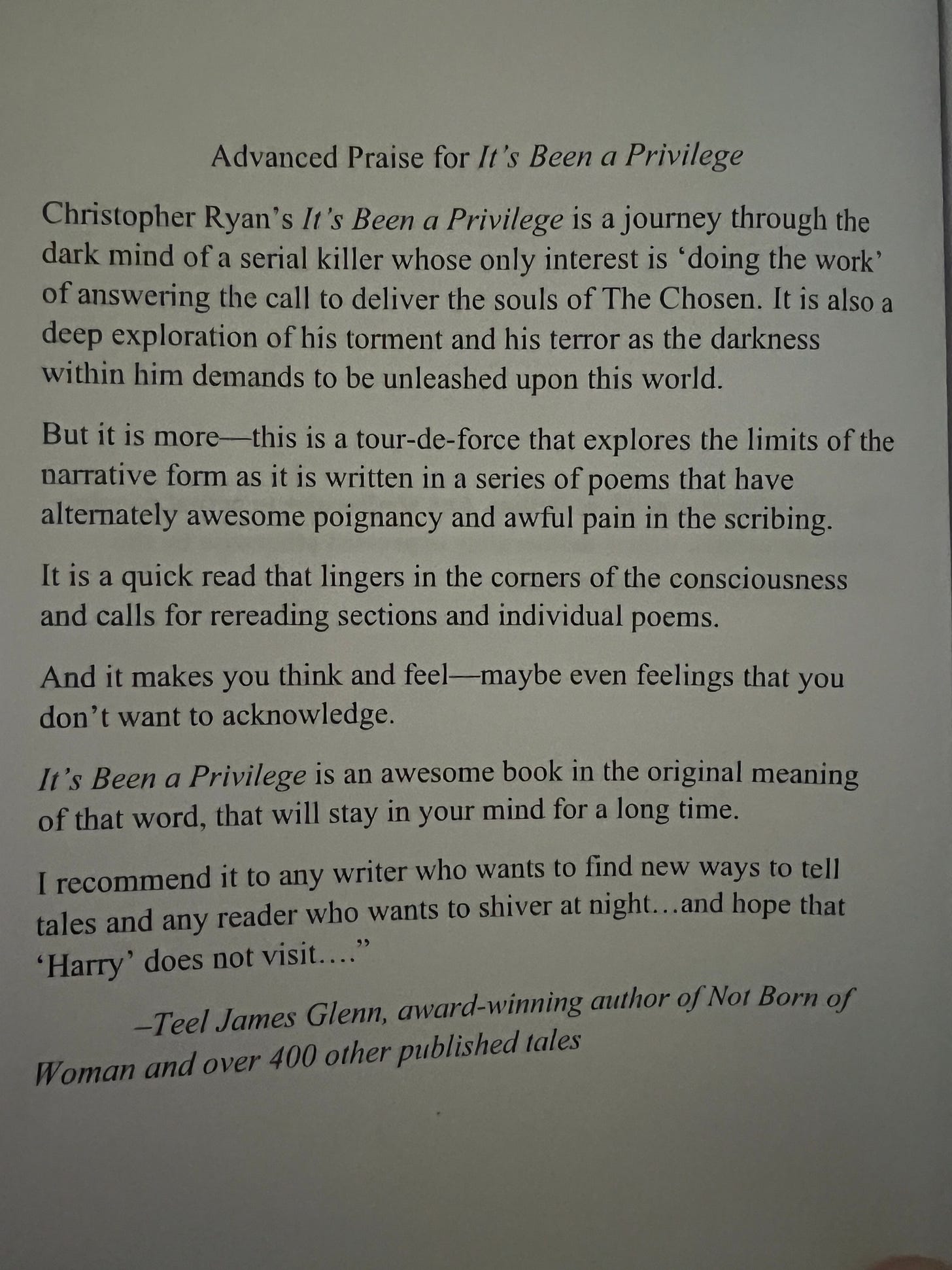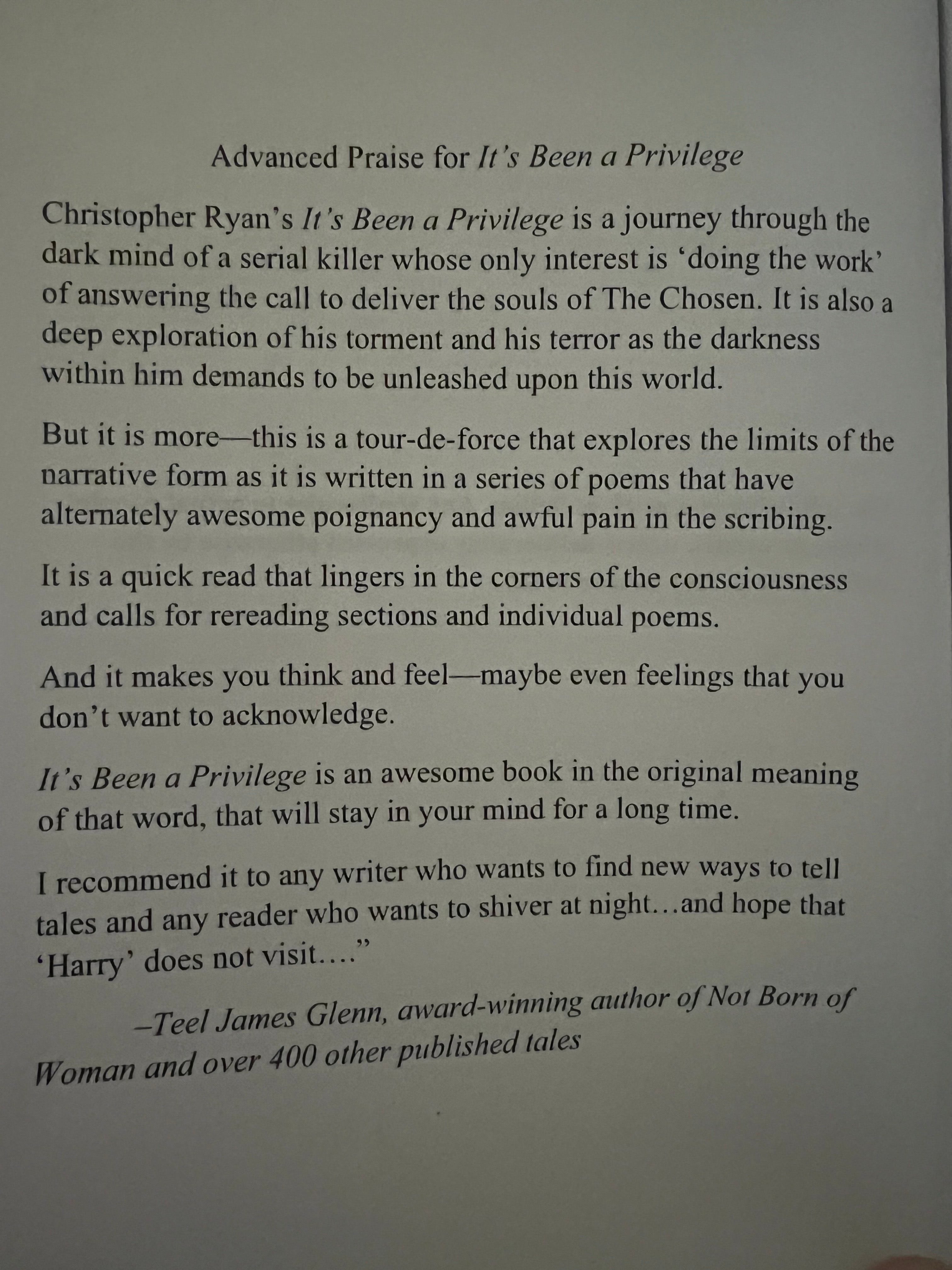 My debut as a published poet happens on March 31st from Alien Buddha Press. It’s Been a Privilege is a horror story told in verse. Here’s advanced praise from award-winning author Teel James Glenn: